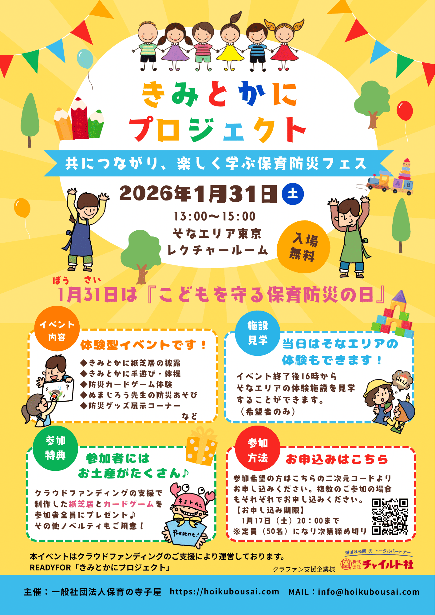 子どもたちと保育者が一緒に楽しみながら防災を学べる体験型イベント「きみとかにプロジェクト」を開催します。紙芝居や体操、防災カードゲーム、防災グッズの紹介など、遊びと学びがぎゅっと詰まった2時間。